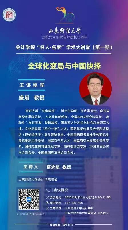 传薪七十载,筑梦新时代。在喜迎山东财经大学七十华诞之际,学院创立“名人·名家”学术大讲堂,广邀海内外学术名家,分享学术思想与学术智慧,推动学院学术研究,促进学院进一步发展。