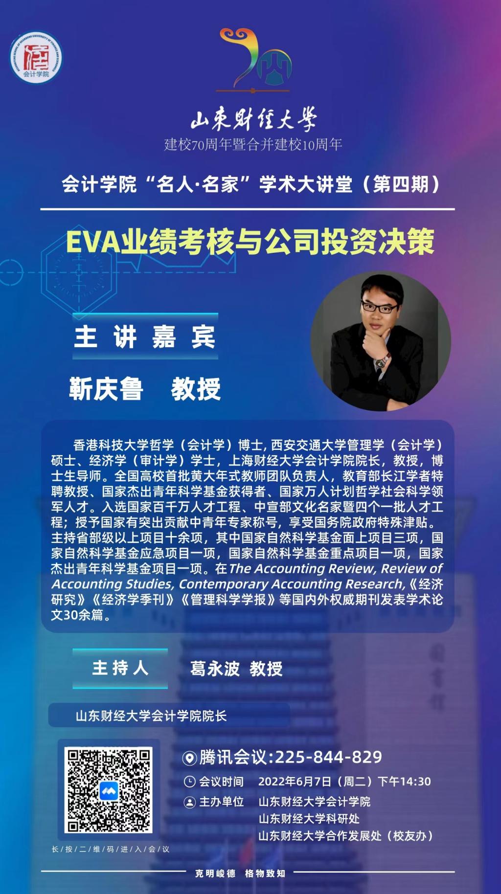 第四期“名人·名家”学术大讲堂将由上海财经大学会计学院院长靳庆鲁主讲,主题为:EVA业绩考核与公司投资决策。