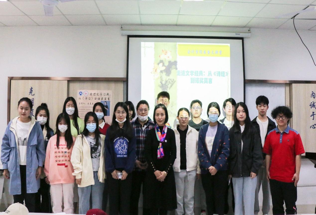 党的二十大报告提出,“推进文化自信自强,铸就社会主义文化新辉煌”。为进一步提升会计学院优良学风,推动“书香会院”建设,营造浓郁的读书氛围,增强文化自觉,坚定文化自信,2023年3月30日下午,会计学院“书香大讲堂”在圣井校区6230教室精彩开讲。本次主讲嘉宾王美春副教授为大家作题为“走近文学经典:从《诗经》到诺奖莫言”的报告。会计学院22级学生代表参加,讲座同时进行了线上直播。