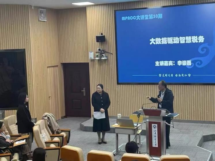 为助力师生把握税收征管智慧化转型趋势,10月18日上午,会计学院(MPAcc中心)特邀智慧税务、税收大数据与风险管理领域的资深专家、原国家税务总局山东省税务局税收大数据和风险管理局局长、二级巡视员李崇西开展了题为《大数据驱动智慧税务》的专题讲座。此次讲座采用线上线下相结合的方式,由MPAcc中心副主任丁鸿雁教授主持,2024级、2025级会计专业硕士研究生和会计学院(MPAcc中心)部分教师参加了讲座。
