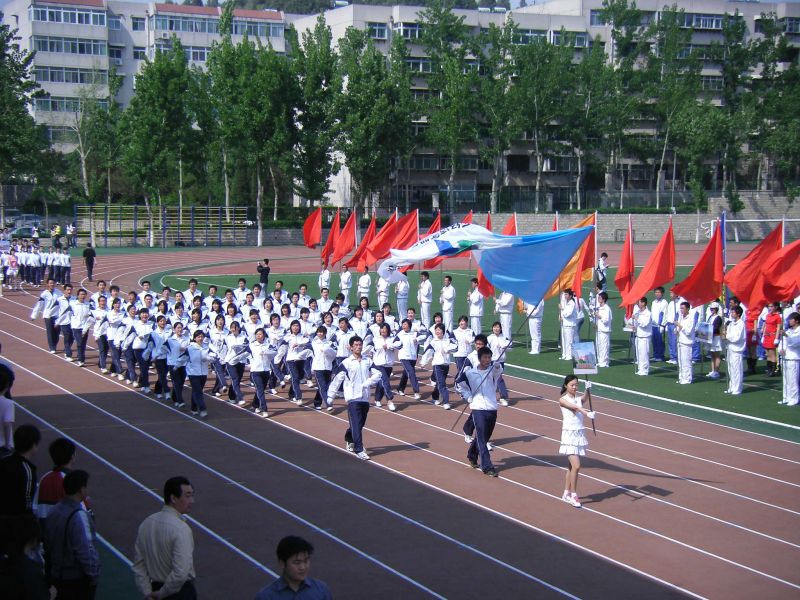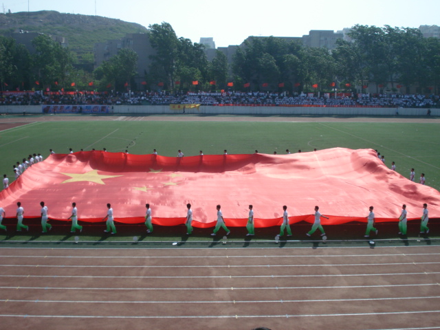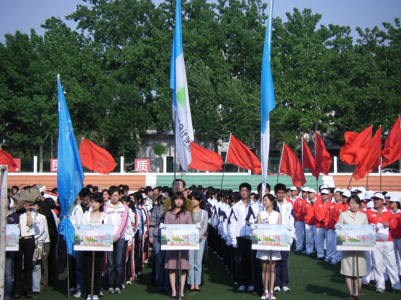 八点整,以红旗为领,锣鼓队、花束队、学生与教职工方阵列着整齐的步伐依次入场。在高大的白杨树背景下,他们雄姿英发就像待点的兵。校党委书记张体勤庄严宣布2008年运动会开幕,在国歌声中,在展起的红旗下,一个新的时刻开始到来。接下来,郝书辰院长致开幕词,在奥运的大背景下,他号召我们办好运动会以实际行动支持奥运。在接下来的团体操和太极扇表演中,在场的观众都深深被他们的精彩演出所折服,变幻的队形、或优美或有力的舞姿不仅体现了同学们的辛勤和努力,更表现出新一代大学生的智慧与创新。