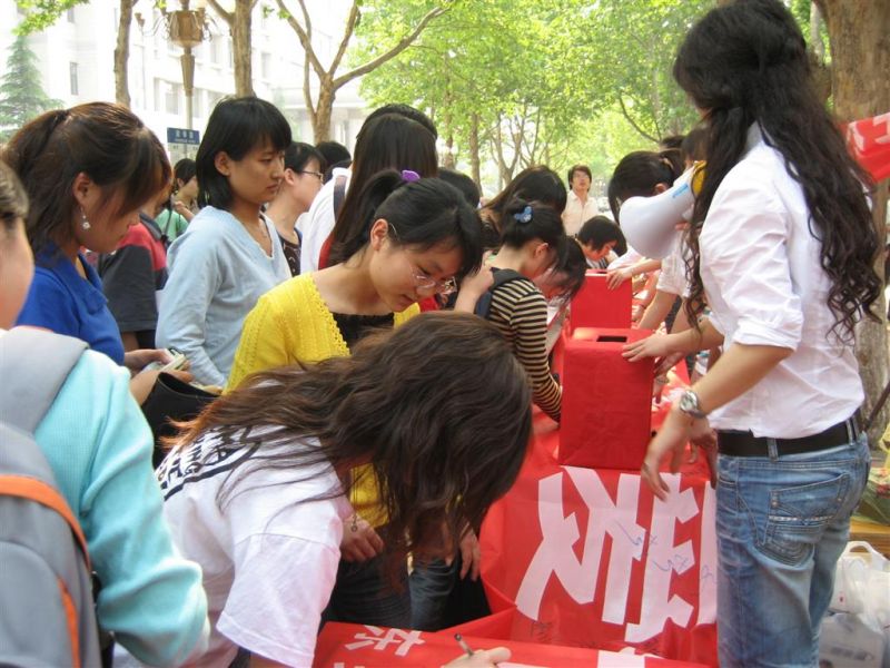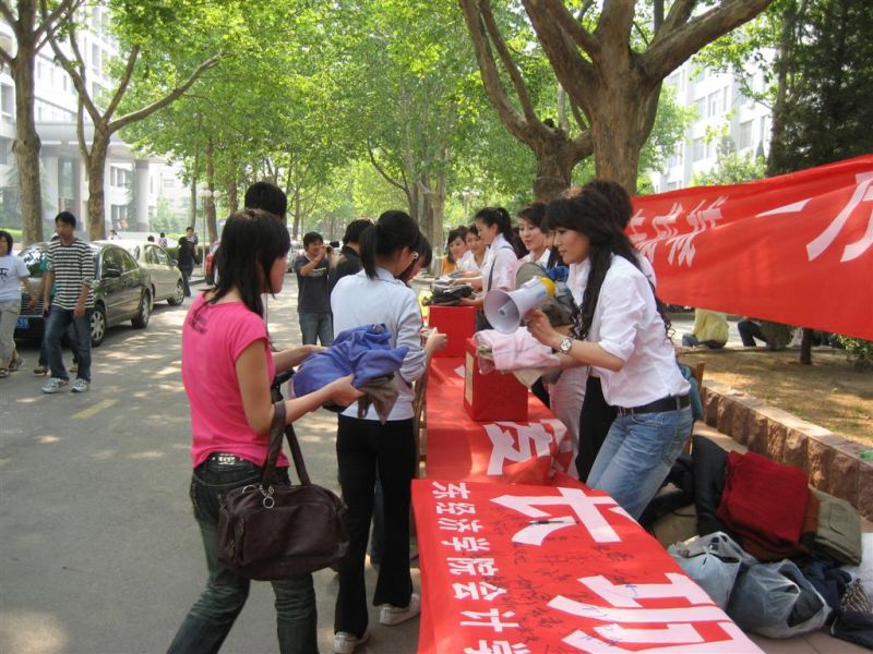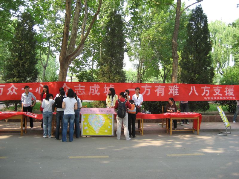 地震无情人有情。5月15日下午会计学院联合山东电视台公共频道新闻女生组在本部榕园举办了为灾区人民募捐的活动。会计学院学生会联合山东电视台新闻女生组栏目组成员组织参与了此次的募捐活动。