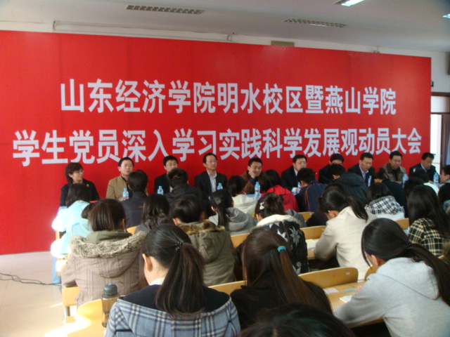 3月26日下午,山东经济学院明水校区暨燕山学院学生党员深入学习实践科学发展观动员大会在明水校区3217教室隆重召开。会计学院的学生党员参加了此次会议并认真学习了会议内容。