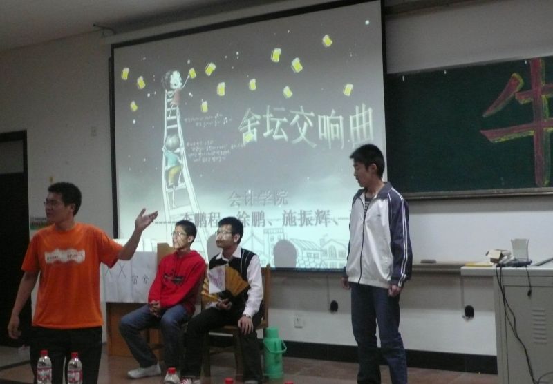 会计学院第五组参赛,对方是经济与城市管理学院。会计学院的小品《xxx宿舍》带给大家一阵阵欢笑。在判断题环节中,两院相差无几,均赢得热烈掌声,在后两个小环节中,会计学院选手思路敏捷、反应迅速,得分远远超过对方。