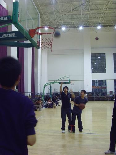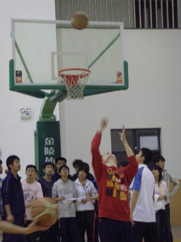 绑腿投球比赛场地上,两名比赛选手绑着腿分别交替在三分线内的规定点内投篮,虽然行进的不便在一定程度上增加了投篮的难度,选手们仍然凭借精湛技术、默契配合投出优美的弧线球,赢得了在场观众的阵阵掌声。定点投篮的比赛更是吸引了投篮高手的目光,七个节奏有变化的投球,在加一个三分球,最后来个背后投篮,选手们给观众带来了精彩的表演;巾帼不让须眉,更有勇敢的女生来向男生们挑战,连续三投三中的成绩让观众惊叹不已,“篮球可不只是男生的运动哦!”比赛后这位女选手说。之后的负角度投篮及三分球大赛继续上演了精彩的投篮表演。最后,胡锦程与陈炳宇以八投七中的好成绩获得绑腿投篮的冠军,陈德隆、胡帅旗、刘豪分别夺得定点投篮、负角度投篮和三分球大赛的第一名。