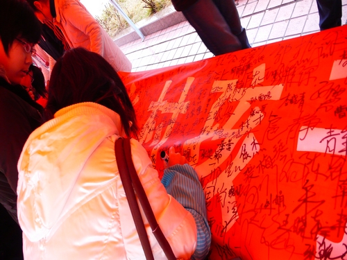 虽然天气湿冷,小雨不断,但是丝毫没有影响同学们参加活动的热情。同学们抱着悉心整理一摞摞的杂志书籍前来捐赠,捐赠的书籍多为科普、教育方面的,但也不乏《读者》、《青年文摘》等优秀杂志。还有的同学在长长的条幅上签下自己的姓名,留下自己的祝福。与此同时,济南电台Music88.7和章丘电视台也派出记者前来采访报道本次活动,大大扩大了本次“小桔灯爱心捐书活动”的影响力。当媒体记者采访会计学院王佃冰老师时,王老师说道:“爱心捐书活动仅仅依靠我们一个学校的力量是远远不够的,我们希望通过媒体的宣传推广,号召在济高校,号召全社会关注贫困地区的儿童,将爱心传递下去……”最终,活动在一片充满祝福和希望的氛围中结束。