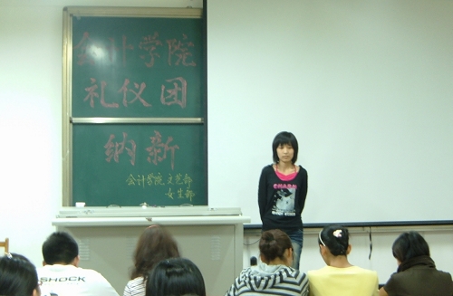 9月26日晚,由会计学院文艺部和女生部联合举办的会计学院礼仪团和飞天艺术团纳新活动在明水校区3202教室举行。文艺部和女生部的成员作为评委出席了此次纳新活动,来自会计学院各个班级的60多名09级新生参加了此次纳新活动。