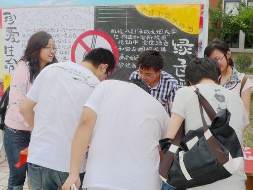 今天是第23个“世界无烟日”,为了给大学生创造良好的无烟环境,会计学院卫生部倡议所有同学都投入到“争做无烟大学生,构建和谐新校园”的活动中来,让大家一同来营造绿色、和谐、无烟校园,远离香烟危害,珍爱生命健康。同学们都积极在“争做无烟大学生,构建和谐新校园”的条幅上签上了自己的名字,以表决心。