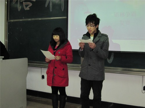 11月21号晚六点半,由会计学院心翔语艺社主办的“语林争霸赛”复赛在明水校区1206教室顺利进行。心翔语艺社明水负责人张立、秘书处曾祥娇、宣传部任文君等09级理事出席并担任本场比赛的评委。