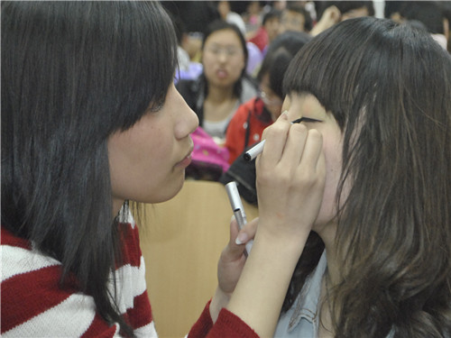 比赛伊始,主持人介绍了到场嘉宾和评分细则。本次决赛分为发型设计和彩妆设计,发型设计以100分满分而彩妆分为生活妆和舞台妆各100分。此次决赛彩妆组有13组选手参加,同时发型组也有7组同学进行激烈的角逐。随着比赛选手和模特一一上场亮相,比赛正式开始。比赛规定,每位选手都有40分钟的时间为自己的模特上妆。与此同时,专业的发型设计师为一位在场观众设计最新潮的发型,同时为我们讲解平时护肤和护发的问题。在比赛过程中,观众可以用上人人网留言及发短信的方式参与比赛,同时随机抽取幸运观众。主持人还随机采访了现场选手及观众,现场气氛一度火爆,大家对比赛结果充满期待。40分钟后,参赛选手依次登台,每组选手都有自己的风格。在彩妆设计中,有魅力十足的新娘妆,可爱的娃娃妆和清爽的运动妆。发型设计中,有可爱俏皮系,甜美纯情系,流行时尚系等多种风格的设计。选手们不仅锻炼了自己,也赢得了现场评委和观众的一致好评。最终,刘果果同学以她的新娘妆在彩妆组中脱颖而出,摘得桂冠;发型组的一等奖由可爱俏皮系发型的设计者邢天琪同学获得。