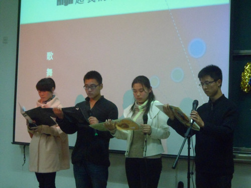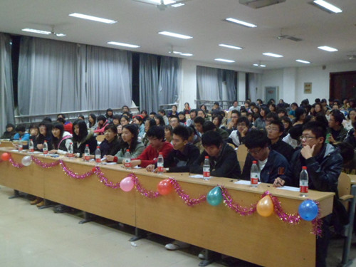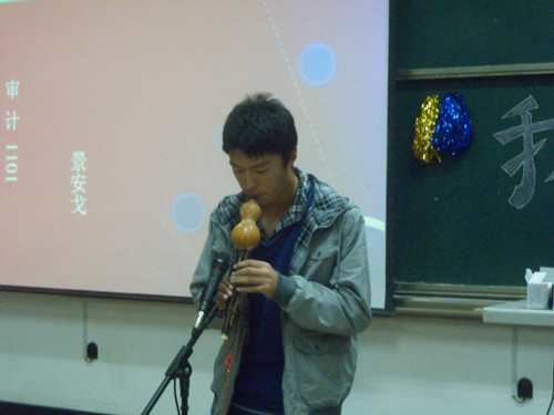 当晚六点半,晚会正式开始。会计学院每个班级表演一到两个节目,由嘉宾进行打分,最终评出奖项。会计1101班的《穿越了没》利用时下最流行的穿越题材,将大学生既要认真学习,又要积极参加各种活动的主题充分的展现了出来,别出心裁,令人耳目一新。会计1105班同学表演的相声《夜行记》则利用自己编写的最简单通俗的语言让在场的每一位观众开怀大笑。资产评估1101班的《青春课堂》中,一个个古灵精怪,充满个性的同学,让我们看到了自己作为学生时的身影;一段广播体操的表演让我们想起了自己中学时的美好时光;老师深沉却富有哲理的话语让我们懂得了珍惜自己的青春,珍惜美好的时光。此外葫芦丝演奏《月光下的凤尾竹》,雅洁灵巧,朴而不拙,突出了东方神韵;诗朗诵《雨巷》将颓圮的篱墙,冷冷的哀怨的蒙蒙细雨等环境渲染和游子对丁香一样的姑娘的期待展现的淋漓尽致;一曲《精忠报国》更是唱出了保卫国家的雄心壮志……