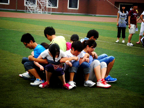下午2点30分,趣味运动会正式开始。据悉,本次活动共分为五个趣味项目,它们分别是:“坐地起身”、“老鹰捉小鸡”、“人多足少”、“丢沙包”、“穿衣引线”。各项目按时间的顺序依次展开,首先进行的是“坐地起身”项目。在本项目的比赛中,各队队员集思广益采取各种有利的方法,促使队内动作协调一致,从而加快比赛速度。在随后进行的传统项目“老鹰捉小鸡”环节中,体育部传承我院“创新”的精神,对项目进行了大刀阔斧的改革,以使队员均能充分参与到比赛中。本次比赛的各项项目均有考察的侧重点,“人多足少”环节则是考察的队员们的智力和协作能力:队员们要在固定场地进行五次的循环跑,并通过限定落脚的足数来增加比赛难度。在难度系数最大的第五次循环跑中,有的队中一名队员抱起三名队员起跑,并通过其余两名队员单脚协调,从而遵守六人五足的比赛规则。其高难度的动作令全场人员惊叹不已。而此后的“丢沙包”、“穿针引线”项目,在考察了参赛队的团结程度的同时,还考验了队员们的敏感度和细心程度。