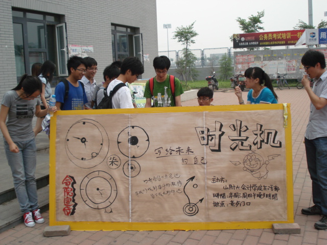 3年后的我们,会是怎么样的呢?会不会记得此刻奋斗的心情、那些曾经朝夕相处的脸、对自己承诺的话……2012年5月30和31日,圣井校区会计学院学生会生活部组织了一场名为“时光机—— 给未来的自己写封信 ”的活动。此次活动以规划未来、放飞希望为主题,号召广大同学们以此为契机,憧憬未来,牢记心中的梦想。