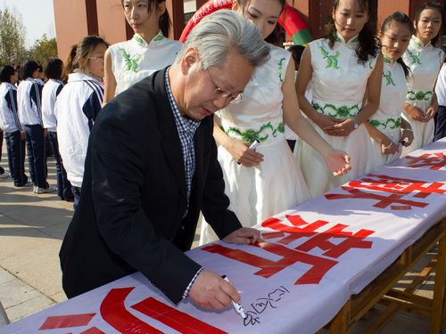 上午十时许,活动正式开始。由会计学院200余名新生组成的方队整齐划一的集合在一起,共同迎接党的十八大的召开,祝福新财大的发展。首先,由学生党员代表侯晓光发言,他表示:作为一名大学生党员,在党的十八大召开在即,又恰逢新财大挂牌之初,有责任与义务肩负时代重托,刻苦钻研,奉献党和国家、奉献学校。随后,在“歌唱祖国”的背景音乐下,在场领导写好祝福语,与学生们一同放飞手中的气球。同时,学生方阵变换成“十八大”字型,共同表达了对党和学校的美好祝愿。最后,副校长胡文波在印有“喜迎十八大,奉献新财大”的横幅上首先写下“心向党,跟党走”的话语,并与其他学校领导一同带领学生在横幅上签名。至此,“喜迎十八大,奉献新财大”系列活动启动仪式圆满结束。当天,山东教育电视台、章丘电视台等媒体均赴现场对此次活动做了专题报道。