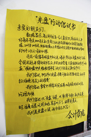 3月29日,为响应厉行节约的号召,拒绝“舌尖上的浪费”,会计学院圣井校区学生会组织“光盘行动,节约为赢”宣传活动,号召全体师生积极参加到“光盘行动”中来。