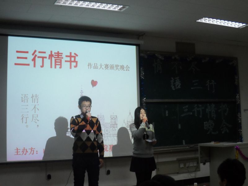 12月11日,由山东财经大学会计学院基本功部主办的主题为“情不尽,语三行”的“三行情书作品大赛颁奖晚会在明水3217拉开帷幕,会计学院学生会各部相关负责人员出席了晚会,同学们踊跃参与,教室里座无虚席。