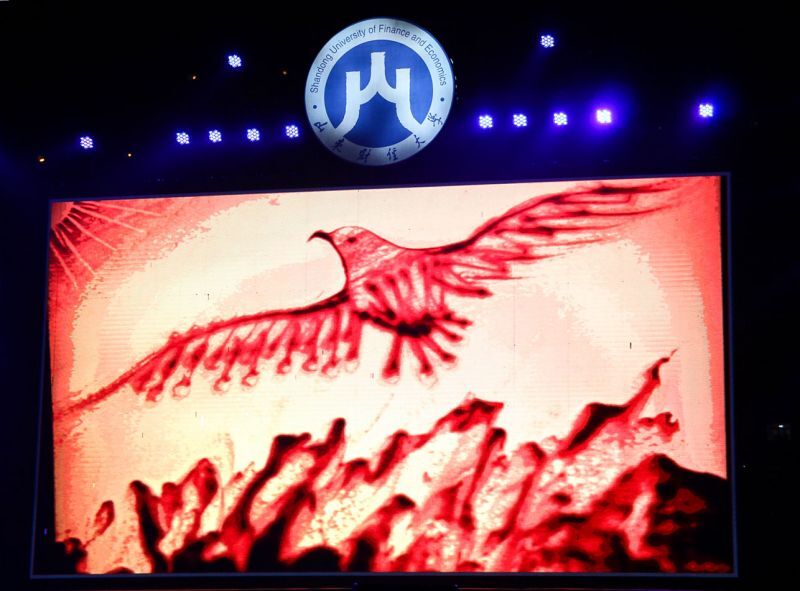 整个晚会精彩纷呈,高潮迭起,节目形式丰富,内容新颖。其中,会计学院师生们在晚会中绽放出璀璨的艺术光彩。首先,会计学院吕晓燕老师等四位师生,为晚会送上诗朗诵《财大,一路走来》。他们深情的诵读,慷慨激昂的语气,以广博天下的情怀为现场师生讲述财大一路走来的风雨艰辛和辉煌成绩,极大的激起了同学们对财大的自豪感。他们期待和新生“心连心,手挽手,共同托举起新财大喷薄的朝阳”。随后,会计学院合唱团带来合唱节目《财大颂》,合唱团以恢弘的气势和强大的气场,将财大的风采和学子的精神面貌展现的淋漓尽致,也将晚会气氛推向高潮,合唱由会计学院邢楠楠等四位师生领唱。随后,在“灼灼青未了”板块中,来自会计学院宣传部的李雨阳等同学又为我们带来了精彩的沙画表演《飞得更高》,一幅幅精美绝伦的沙画呈现眼前,登山的勇士象征着勇攀高峰的学子,展翅的雄鹰预示着未来的财大定会飞的更高。精彩之后,来自财管1301班的杨宝睿同学为现场观众演唱歌曲《大学问》,用歌声将学习的意义和趣味娓娓道来,带新生感悟“知识跟世界细水长流,智慧用思考照明宇宙”的深意。晚会渐入尾声,会计学院大二学生李英婕和大一新生于淼等人带来朗诵《我以青春的名义宣誓》,号召大学生作为未来的花朵,要“盛开在祖国最需要的地方”。