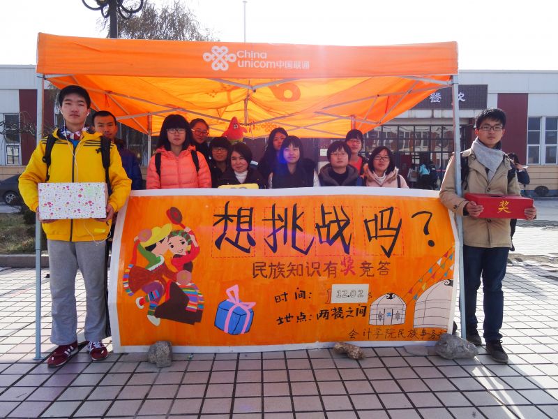为宣传少数民族文化,增强各民族之间的友好交流,12月2日中午,会计学院民族事务部在明水校区悦动广场举办“想挑战吗”民族知识有奖竞答活动。精彩新颖的活动吸引来往的众多同学纷纷驻足,踊跃参与。