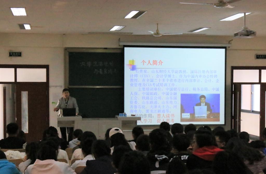 石贵泉老师不仅担任我校会计学院会计信息化系主任,教学经验丰富,更是国际注册内部审计师,山东省财政厅内部控制咨询专家团队成员,全国知名内部审计培训咨询专家,是我校少有的理论教学和实务培训兼优的“双师型”专家。多年来他以会计信息化、内部审计、风险管理和内部控制为主要研究方向,收获颇多。本次讲座他带着自己丰富的阅历与2017级会计学院审计系的新生就“大学生活规划与素质培养”展开了热切的讨论。讲座开始,石贵泉老师对大家进入山东财经大学学习表达了热情的欢迎,同时他也鼓励同学们要珍惜大学时光,努力奋进!石贵泉老师表示,学习贯穿人的一生并且发挥着极其重要的作用,因此希望大家能明白学习的重要性,树立终生学习观念,多去聆听老师、学姐学长等前辈的建议,少走弯路,吸取经验,认真规划人生,不负青春!