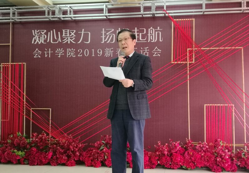 党委书记张涛首先在致辞中表示,2018年是会计学院各项工作硕果累累、捷报频传的一年,教学科研成果喜讯连连,党建学团工作扎实推进,多名优秀教师入选国家专业人才库。过去一年的成绩来之不易,里面凝聚着每一位老师的智慧和心血,也凝聚着全体会计人的汗水与奉献。2019年即将迎来祖国70周年华诞,希望大家继续用逢山开路的闯劲,绳锯木断的韧劲,事不避难,接续奋斗,为会院的明天续写更加辉煌的一页。同时,他也代表学院领导班子,向全院所有职工及亲属致以节日的问候和衷心的祝福,祝大家万事如意,阖家幸福。