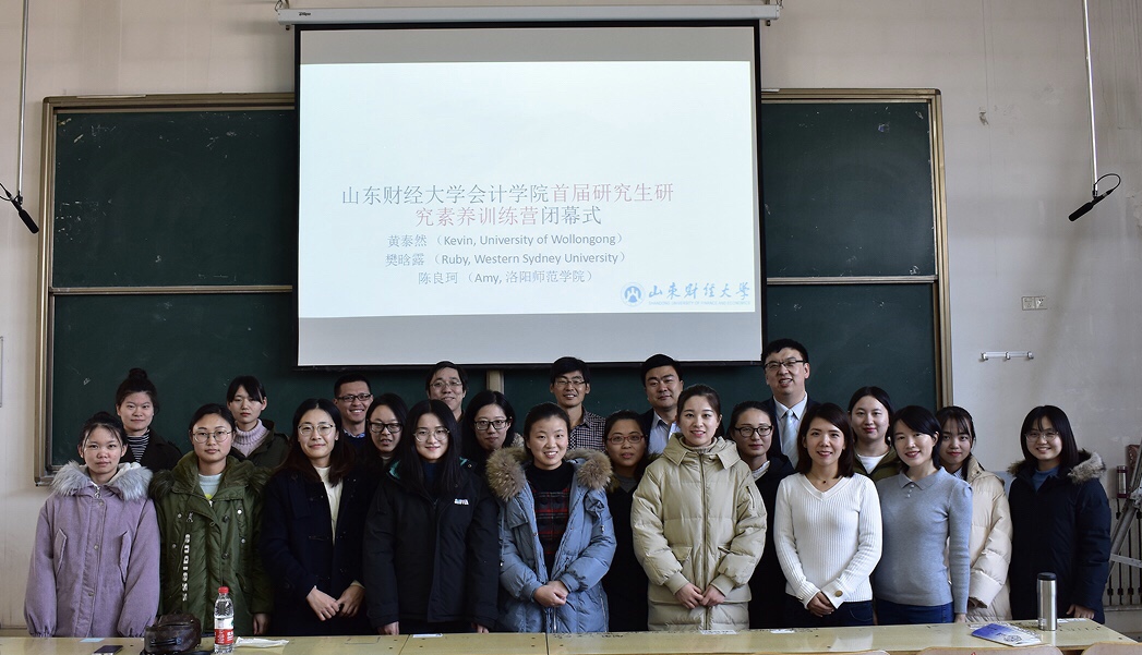 12月24日下午,黄泰然博士的“研究生学术训练营”第五期、第六期在Y301教室举行,此次训练营主要包括特邀嘉宾分享文献综述写作技巧和研究小组汇报展示两部分内容。会计学院孙文刚副院长、西悉尼大学樊晗露博士、洛阳师范学院陈良柯老师、我院朱彩婕副教授、田彩英副教授、韩跃副教授、吴大新副教授、王金磊博士及2018级全体硕士研究生参加了本次训练营。