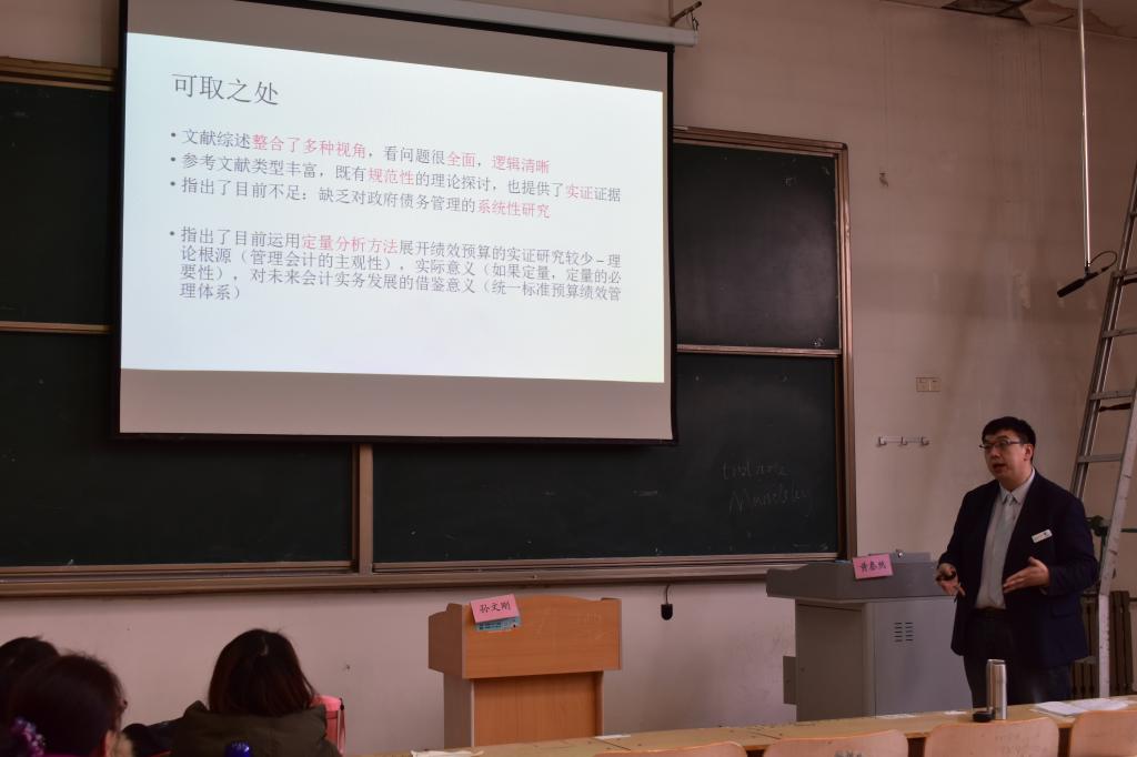 在本次讲座的第二环节,三个小组对文献综述的研究成果进行了汇报展示,三位点评老师也分别指出了其中的可取之处和不足之处。第一小组成员包括王露露、宋艺、于义、张玉洁、张静宜,王露露同学代表第一研究小组进行了《全面预算绩效管理对地方政府债务风险的防范作用研究综述》报告。该报告由全面预算绩效管理研究、地方政府债务风险研究、全面预算绩效管理对地方政府债务风险的防范作用研究、政策建议总结这四个方面组成。黄泰然博士点评说:文献综述整合了多种视角,逻辑清晰,看问题很全面;参考文献类型丰富,既有规范性的理论探讨,也有实证性的实践证据。最后,黄博士建议,需要在政府债务管理的系统性研究方面加以完善。
