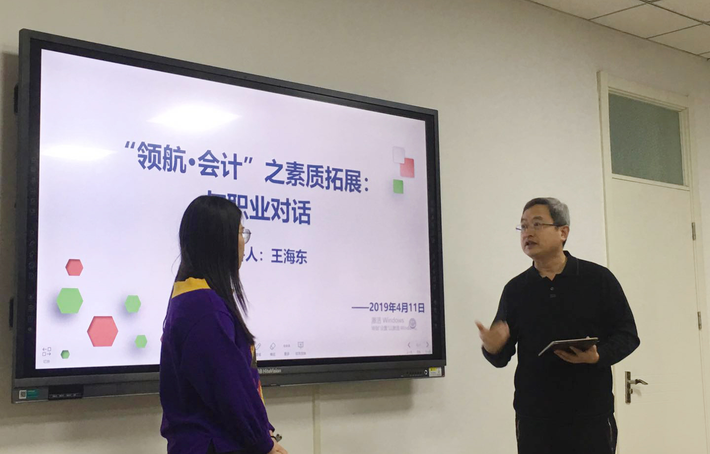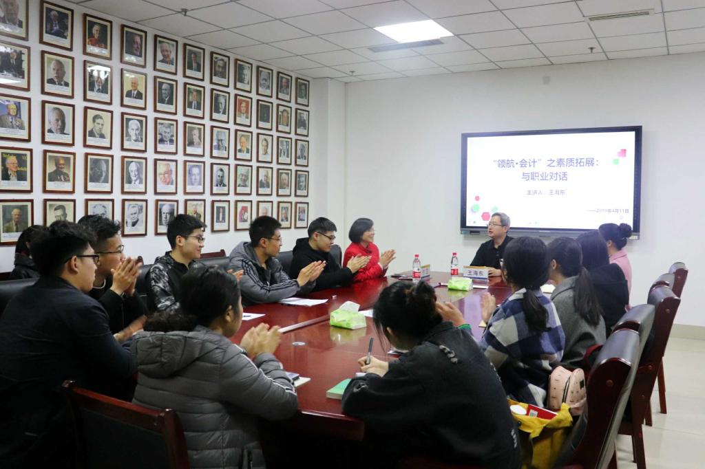 4月11日下午,我校优秀校友王海东应会计学院邀请来到燕山校区,在逸夫楼309进行“领航•会计”交流会,会计学院党委副书记付亚、辅导员张慧娟出席。交流会由付亚主持。