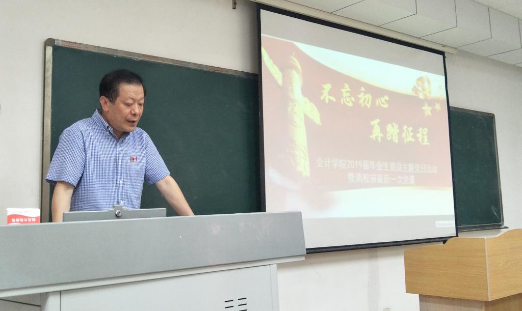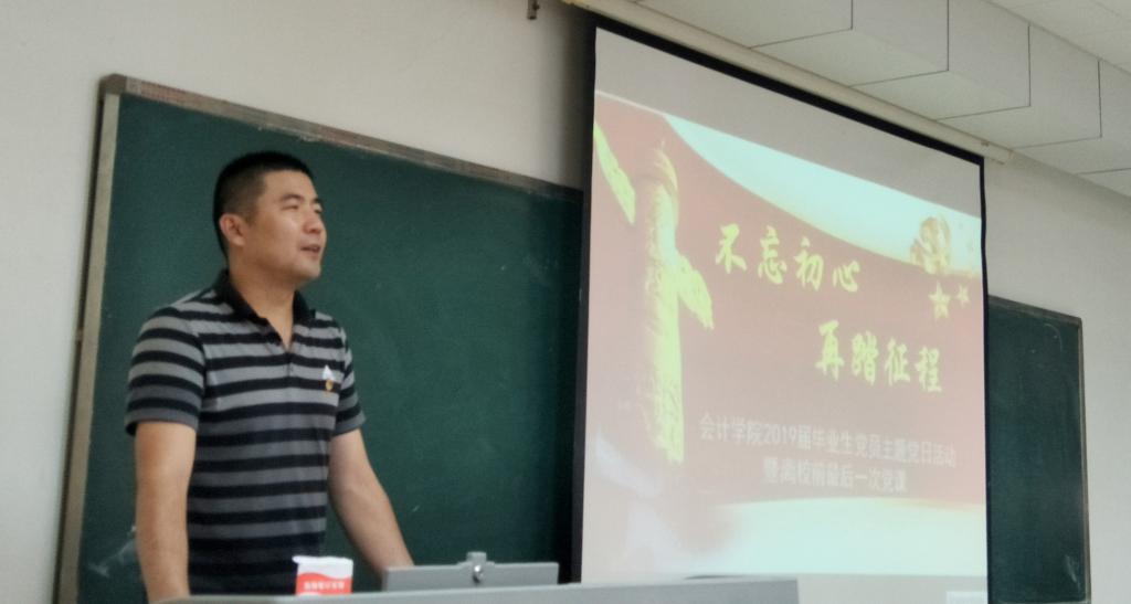 6月20日下午,在建党98周年来临之际,正值19届毕业生离校前夕,会计学院党委组织了主题为“不忘初心,再踏征程” 毕业生党员主题党日活动暨离校前最后一次党课,以新颖难忘、内涵深刻的活动形式为19届毕业生送上母校的祝福与嘱托。活动由学院党委副书记崔东峰主持,学院党委领导班子和全体毕业生党员参加了活动。