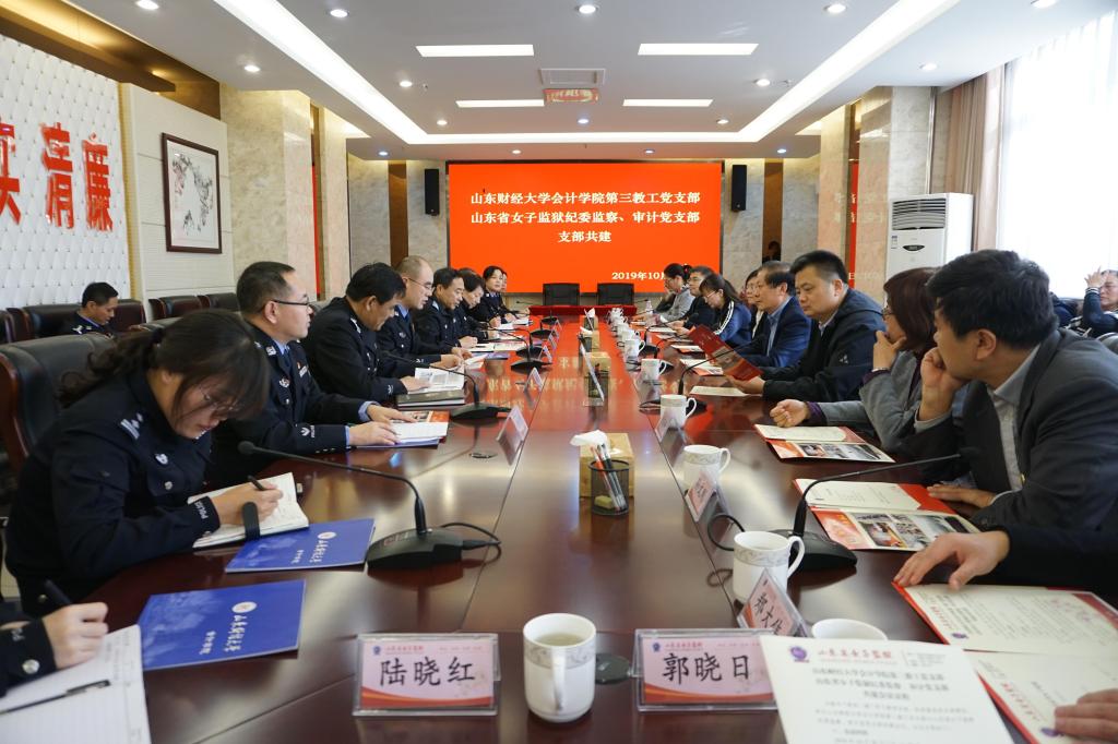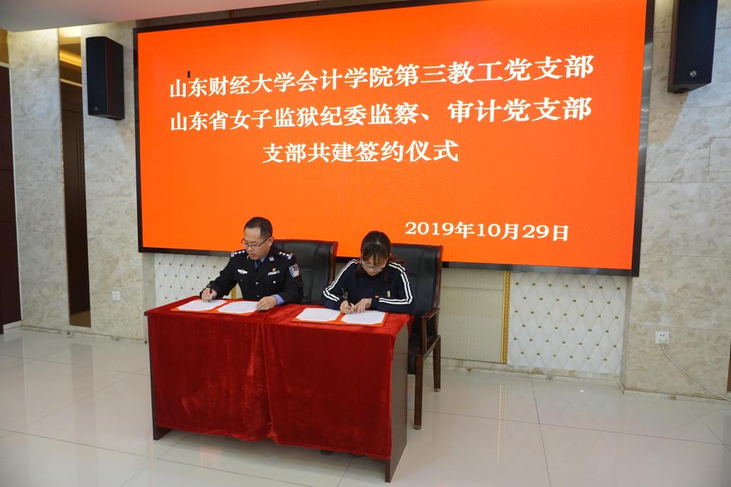山东省女子监狱纪委审计室党支部书记徐庆利、山东财经大学会计学院第三教工党支部书记李秀玉各自介绍了本支部情况,并签署《党支部共建协议书》。
