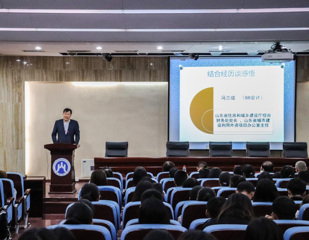 冯兰成结合就业经历有感而发,他认为,工作中应将个人使命、情怀与百姓愿望、诉求紧密结合,在因势而谋、应势而动、顺势而为的同时借势借力,有效利用资源;面对波折要不争功推过、不违规违纪、不固步自封,以忠诚专一、务实低调、勤勉敬业的态度对待组织和自己。他勉励同学们通过跨专业学习、跨岗位锻炼积累经验、开拓视野,从宏观上把握形势和处理问题,不断培养总揽大局与协调多方的能力,凭借饱满的热情、高昂的斗志、严谨的作风、过硬的本领走上工作岗位,开启人生新旅程。