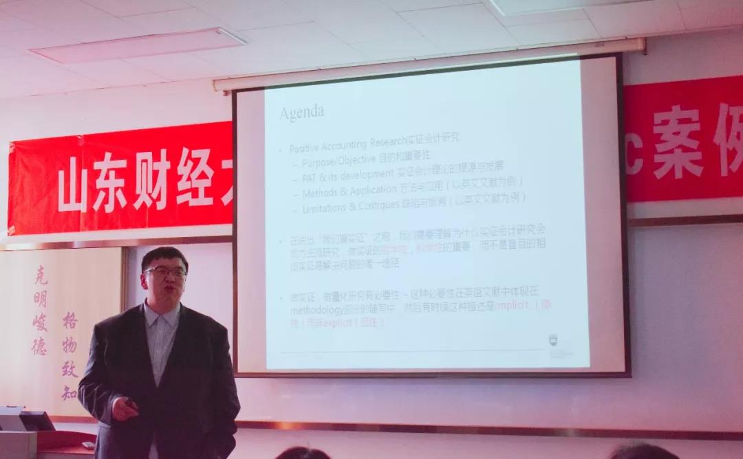 接着,黄博士再次上台为同学们补充讲解实证研究相关问题。黄博士首先再次强调了阅读文献的重要性,告诉同学们要去学习各种数据分析软件。然后黄博士就为什么要做实证研究为同学们做出讲解,并建议同学们在平时的学习中要重视方法论,注意各种前人的成熟或者较为成熟的理论。最后,黄博士为同学们阐明了大数据对于实证研究的贡献,指出大数据在一定意义上弥补了计量经济学的不足,并对于实证研究和会计发展起到一定的推动作用。