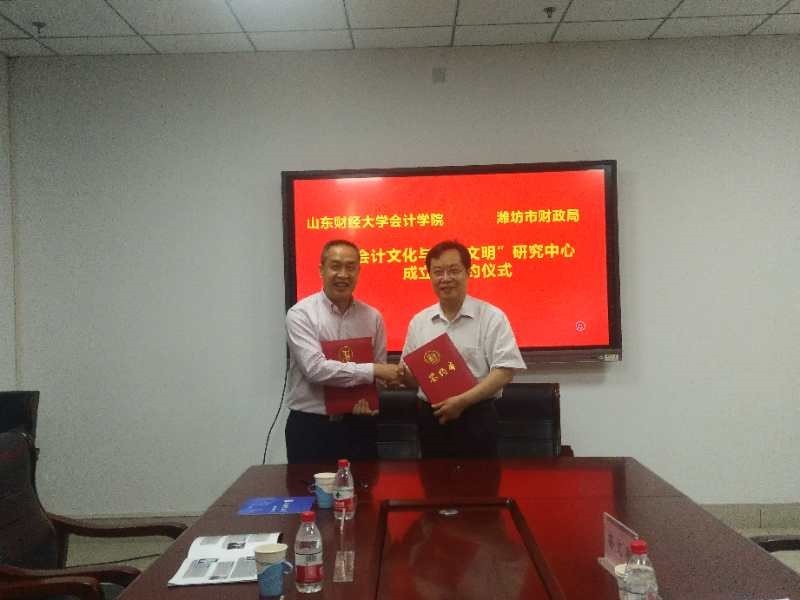 6月12日上午,由山东财经大学会计学院、山东会计博物馆(筹)和山东省潍坊市财政局联合成立的“会计文化与东方文明”研究中心签约仪式在山东财经大学燕山校区举行。潍坊市财政局副局长王献之、山东会计博物馆筹建处主任王增堂、会计科科长周曰海、山东会计博物馆筹建处副主任赵良奎,以及山东财经大学会计学院王爱国、副院长孙文刚、会计思想史研究所所长吴大新出席签约仪式。仪式由孙文刚主持。