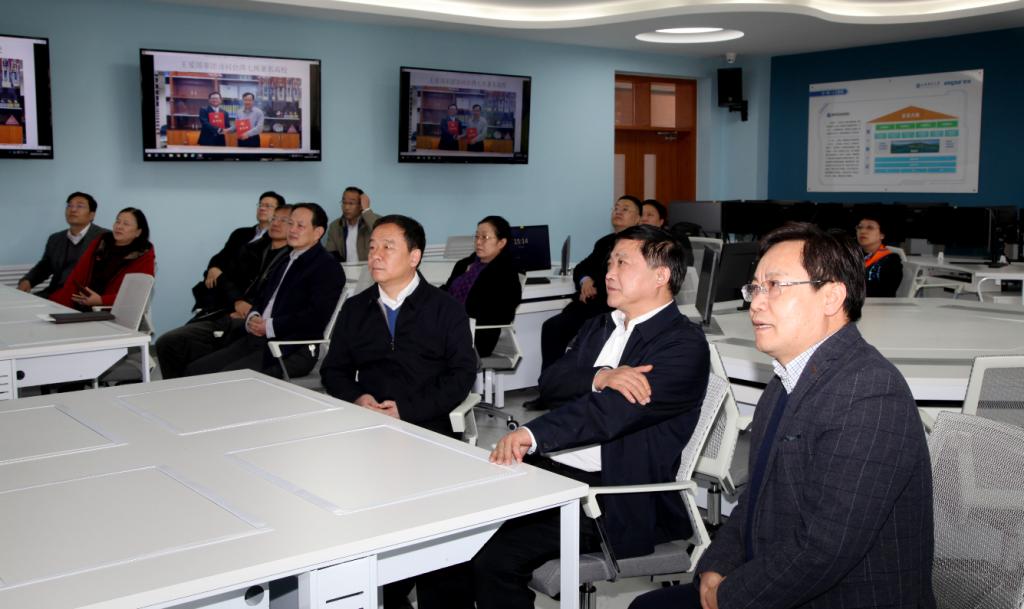 王爱国向各位领导简要介绍了在新技术背景下传统会计转型发展的必要性和可行性,详细介绍了我院智能会计实验室建设的初衷、功能设计和发展前景,并介绍了我院智能会计人才培养方案的具体内容、实施情况以及未来行动思路。