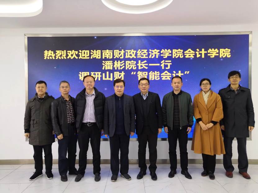 会计学院王爱国院长热烈欢迎远道而来的湖南财政经济学院来访的各位领导、老师,双方针对新形势下高校智能会计人才培养难点和困惑等问题进行了交流。王爱国院长及潘斌院长先各自介绍学院基本情况和特点,王守海副院长介绍了智能会计进展,牛艳芳主任详细介绍了智能会计培养的核心理念和教材建设情况,湖南财政经济学的各位老师介绍开展智能化会计人才培养的进展,十分肯定山财会计学院在智能会计人才培养的思路、方法,对相关教材也表示出极大的兴趣。双方领导、老师将本着“共建、共治、共享、共赢”的思想推动智能会计建设。最后,各位领导、老师一同参观了智能会计实验室,并合影留念。