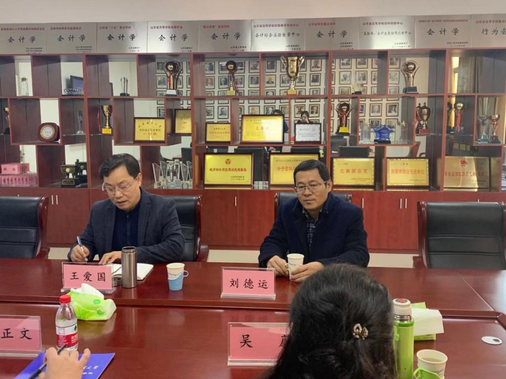 王爱国院长、刘德运副教授首先对山东评估协会领导的到来表示热烈的欢迎,并就协会对学院一直以来的支持和帮助表示感谢。刘教授首先对学院资产评估专业的办学历史、课程设置、师资队伍和专业的发展、定位进行了详细介绍。