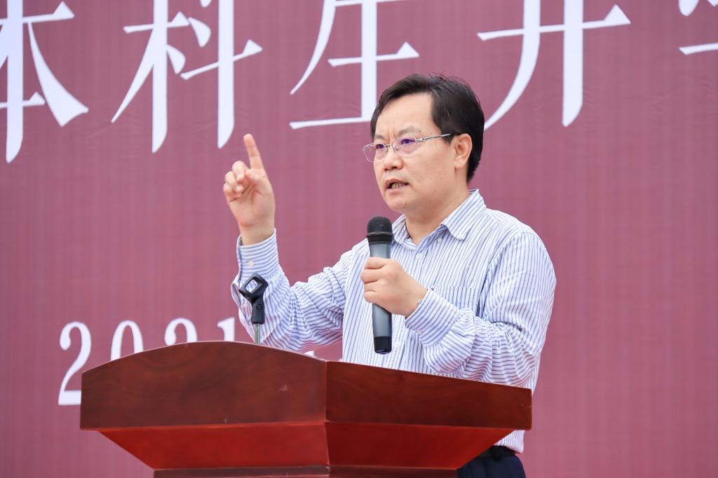 典礼在国歌声中拉开帷幕。邵文涛首先对2021级本科生表示热烈欢迎,他从新时代新青年的责任和中华民族的伟大复兴两个方面,向大一新生提出要求,强调作为新时代新青年,在思想上要胸怀远大理想,树立正确世界观、人生观和价值观,将人生规划与国家发展需要结合起来,积极承担时代赋予青年的强国重任。作为中华民族新生力量,大学生在实践方面要脚踏实地,砥砺前行,为中华民族伟大复兴、为人类命运共同体而不懈奋斗。最后,邵文涛勉励同学们要勇于创新、追求卓越、胸怀天下、厚植家国情怀,希望同学们能够脚踏实地、砥砺前行,创造山财大和会计学院新的辉煌。