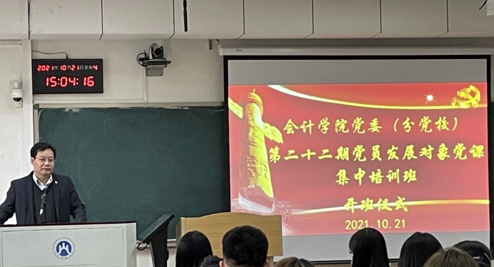 为进一步保证党员发展质量,提高党员发展对象的政治素养和理论水平,按照校党委组织部部署和学院党委工作安排,会计学院于2021年10月21日在燕山校区逸夫楼Y119教室举行会计学院第二十二期党员发展对象党课集中培训班开班仪式。院长王爱国出席开班仪式并讲话,98名新一批党员发展对象参加,开班仪式由党委专职组织员郑大伟主持。
