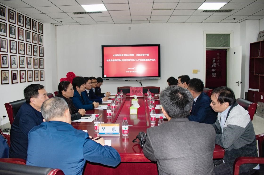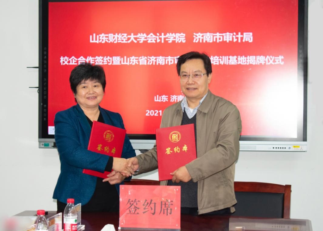 济南市审计局副局长吴冬梅、会计学院院长王爱国代表双方共同签署了合作协议