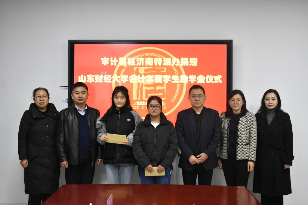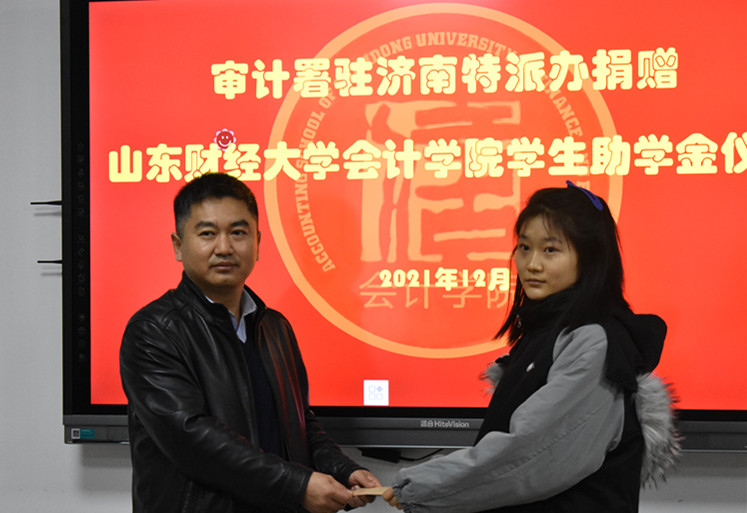 12月16日下午,审计署驻济南特派办助学金捐赠仪式在山东财经大学燕山校区逸夫楼Y309会议室举行。审计署驻济南特派办机关党委人事教育处处长李军,人事教育处三级调研员张洪萍,人事教育处三级主任科员王宝璐以及会计学院党委书记邵文涛、党委副书记付亚、就业办主任史岩与获助学生一同参加活动。