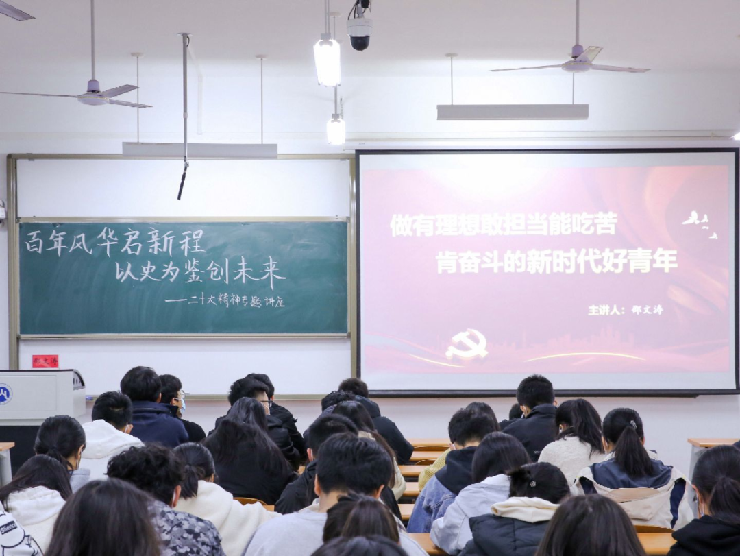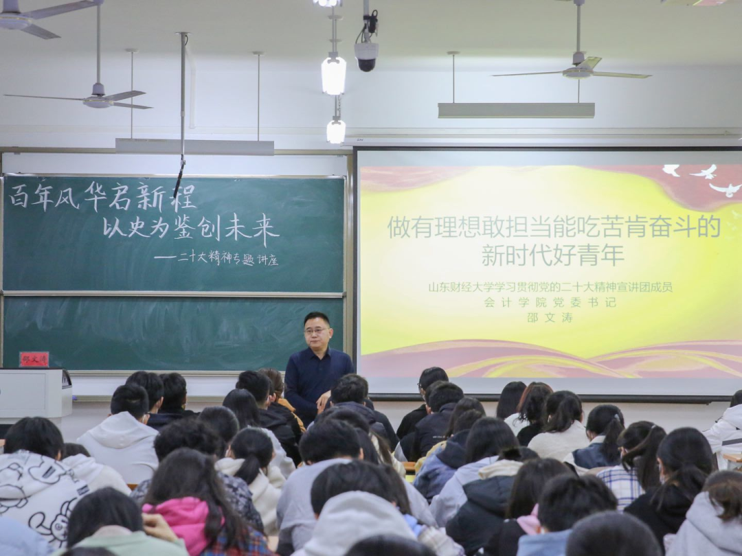 为深入学习宣传贯彻党的二十大精神,把思想统一到党的二十大精神上来,把力量凝聚到党的二十大确定的各项任务上来,引领青年学子坚定不移听党话、跟党走,引导学子们把握历史规律、认清世界形势、融入发展大势,塑造青年学生怀抱梦想又脚踏实地,敢想敢为又善作善成,努力成为堪当民族复兴重任的时代新人,11月15日19:00,会计学院党委书记邵文涛在圣井校区6218教室为学生们开展“百年风华启新程,以史为鉴创未来”二十大精神专题讲座。