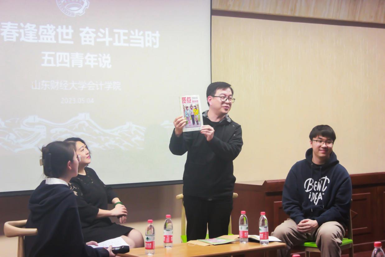 进入提问环节,同学们积极提问,三位校友细心解答。最后,李清照将两期刊物《质点》赠与会计学院,为丰富学院校史图书资源增添了一份贡献。