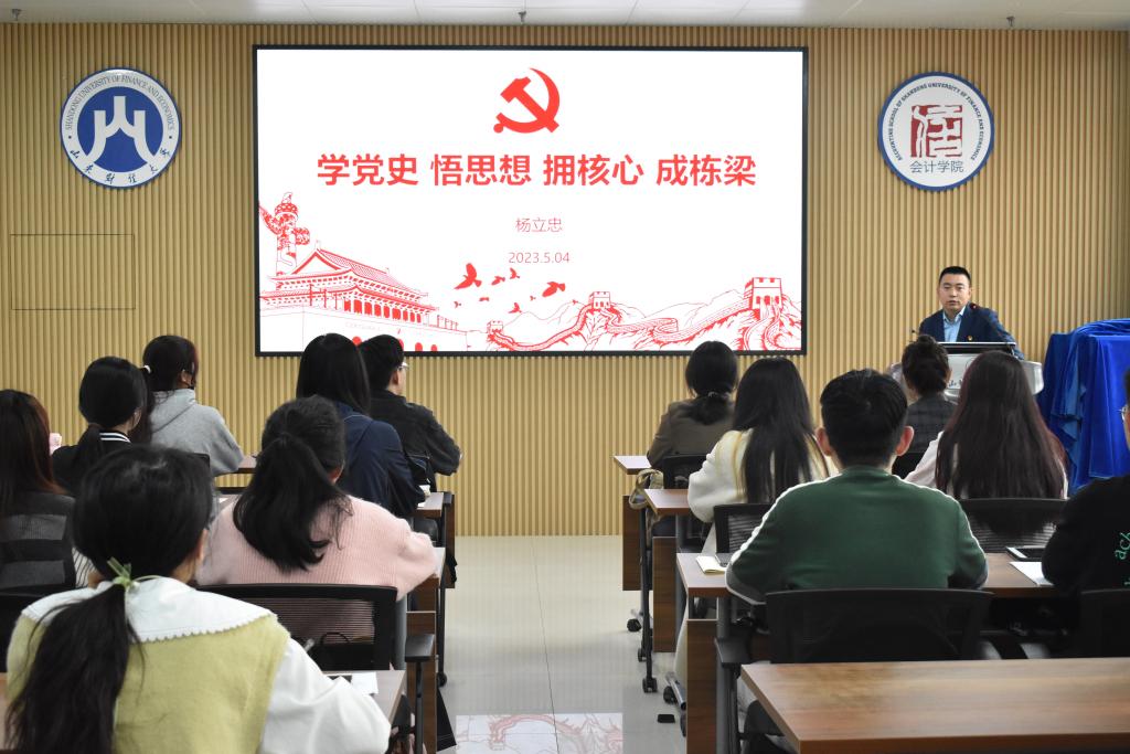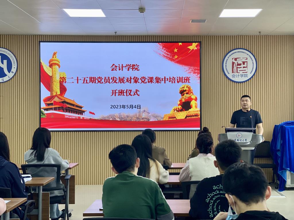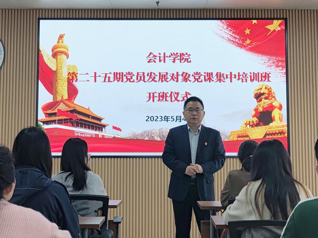 为深入学习贯彻习近平新时代中国特色社会主义思想主题教育,进一步提高党员发展质量,提升党员发展对象的政治素养和理论水平,2023年5月4日,会计学院党委在燕山校区逸夫楼Y410教室举行第二十五期党员发展对象党课集中培训班开班仪式。校党委组织部正处级组织员杨立忠、学院党委书记邵文涛、党委副书记郑大伟、党委组织员张沫出席开班仪式并分别在燕山、圣井校区讲授党课,本批次发展对象和部分党支部书记参加。开班仪式由郑大伟主持。