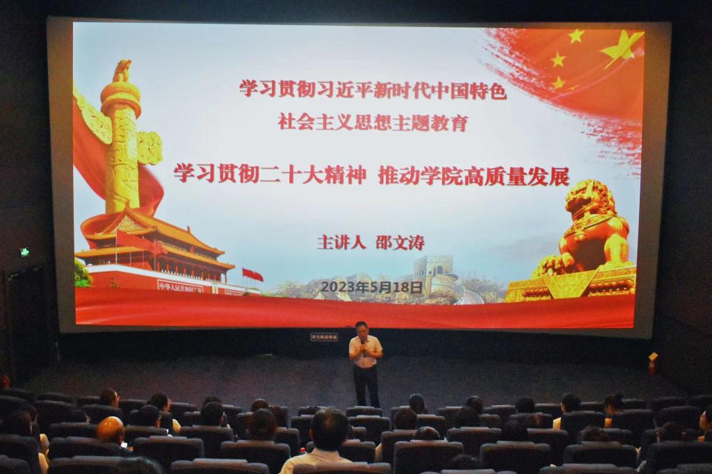 学院党委书记邵文涛以“学习贯彻二十大精神 推动学院高质量高质量发展”为主题,对习近平新时代中国特色社会主义思想的世界观和方法论、党的自我革命、中国式现代化、立足新起点推进学院高质量发展进行了系统阐述。同时提出了以下三点要求,一是要深刻认识“中国式现代化”,把握其历史逻辑、理论逻辑、实践逻辑;二是充分认识“自我革命”的重要意义,带头发扬彻底的自我革命精神;三是全面推进党的建设,深化基层党组织建设,筑牢意识形态阵地,坚定不移把全面从严治党推向纵深,以高质量党建引领学院高质量内涵式发展。