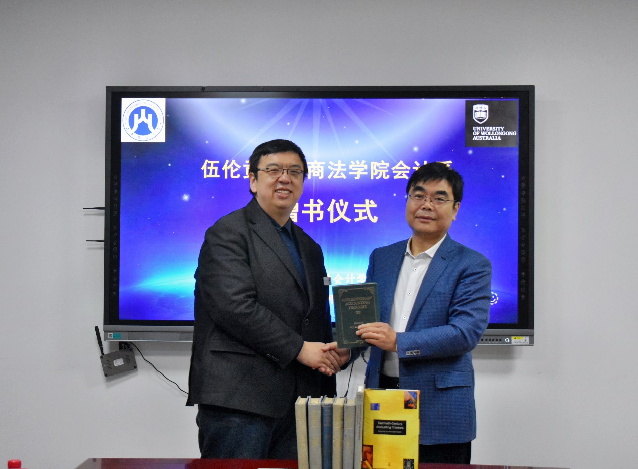 Tairan Huang代表伍伦贡大学商法学院向我院捐赠了Accounting and Society等经典会计著作。这些珍贵的文献是澳大利亚著名会计学家、会计史专家Michael Gaffikin生前藏书的一部分,包括他本人撰写或编著的学术著作、以及他收藏的经典会计理论著作。Michael Gaffikin曾担任伍伦贡大学会计系创始主任,是伍伦贡大学会计学科的奠基人,所开创的会计理论研究与会计史研究事业在澳洲享有盛名。