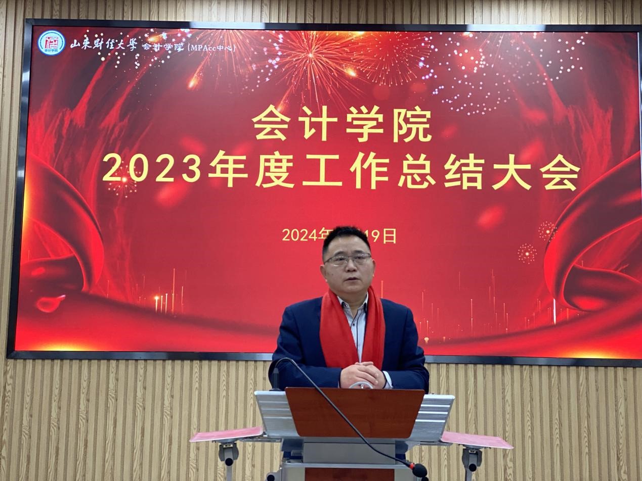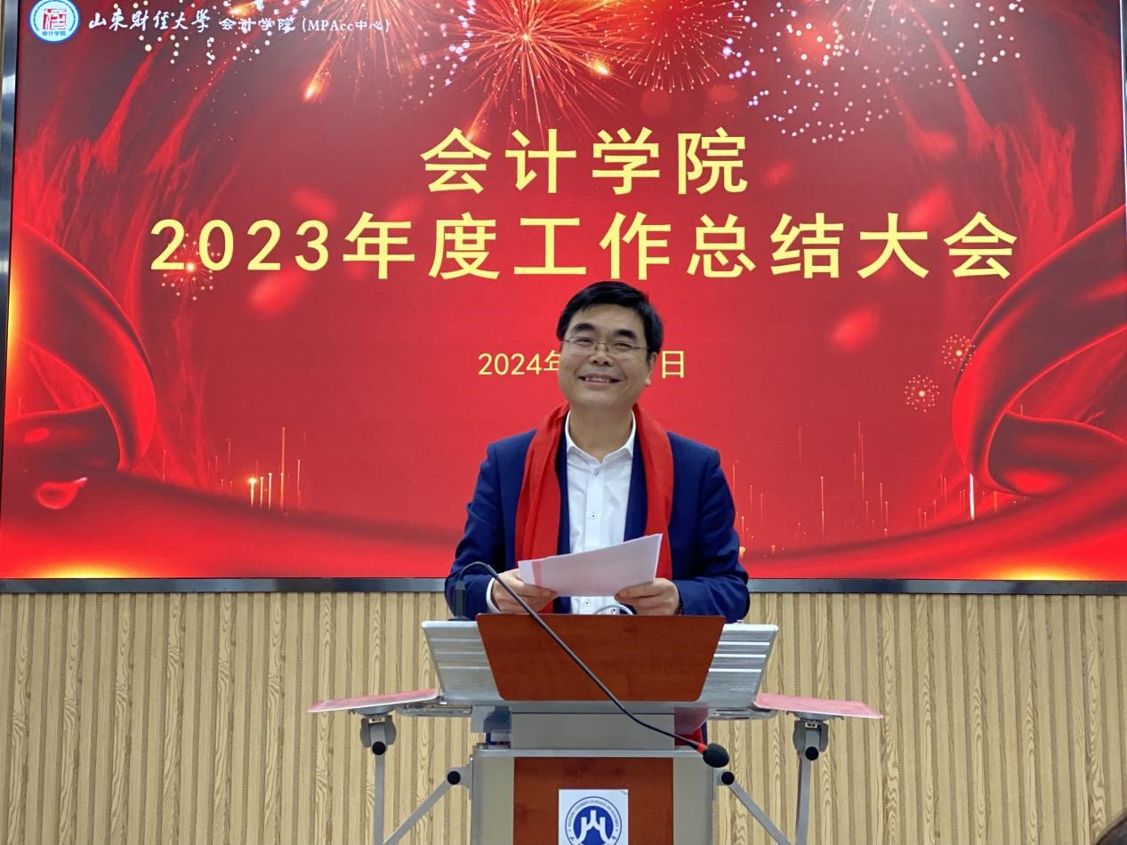 邵文涛代表领导班子,感谢全体老师为会计学院的发展所做出的贡献。他指出,2023年会计学院在党建工作、人才培养、科学研究、师资队伍、学科建设、教育教学、学生工作、校友服务等各方面取得了不错的成绩,各项事业高质量发展。他表示,会计学院将继续以习近平新时代中国特色社会主义思想为指导,加强党的全面领导,党建与业务工作深度融合,落实立德树人根本任务,进一步统一思想、凝聚共识、汇聚力量,推进学院各项事业高质量发展。