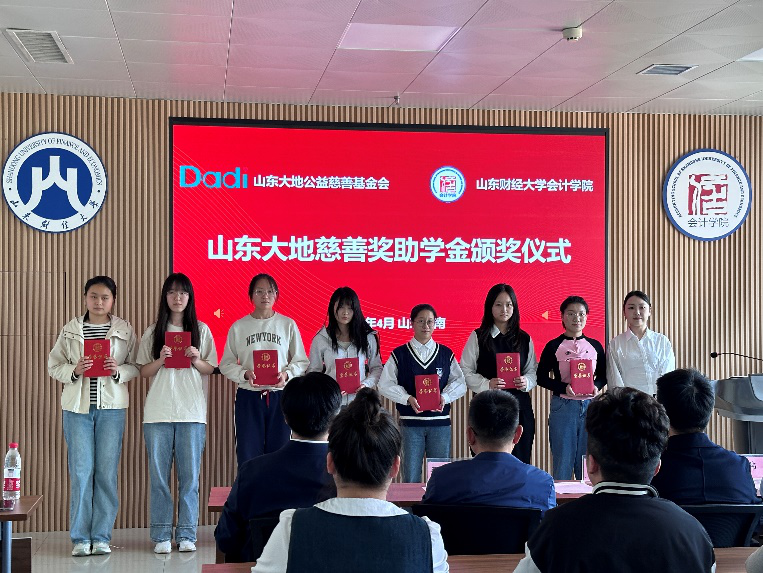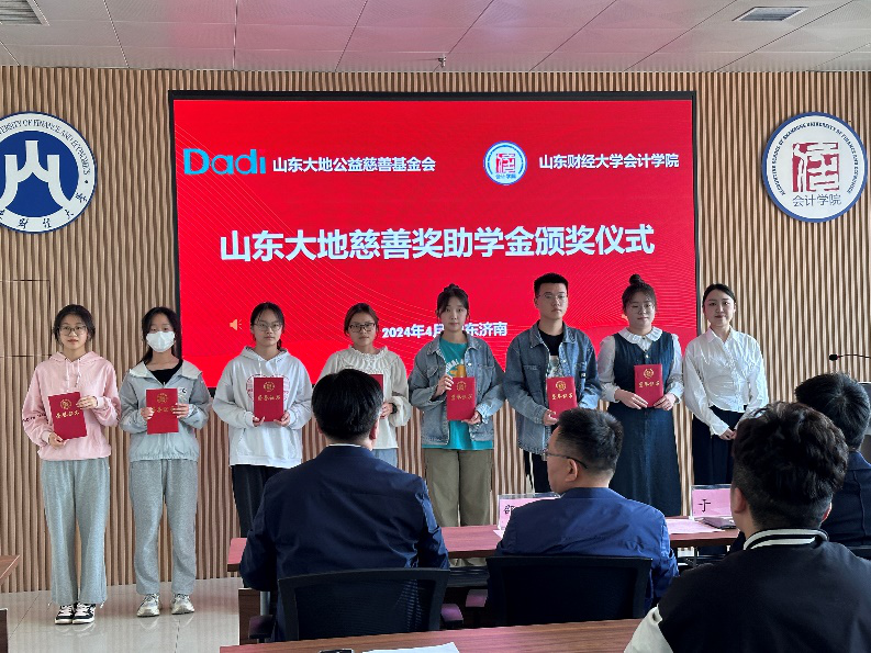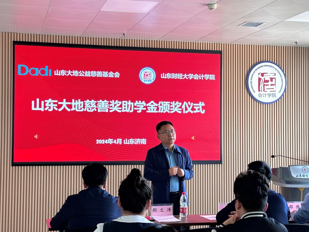 2024年4月11日,山东大地慈善奖助学金颁奖仪式在燕山校区逸夫楼举行,北京大地泰华会计师事务所(特殊普通合伙)执行事务合伙人于洋、人力资源总监陈晓培、人资部王若裴,山东财经大学合作发展处副处长邵伟然、学生工作处副处长周广春,会计学院党委书记邵文涛、党委副书记钟毓卓,会计学院教师代表、学生代表出席活动。