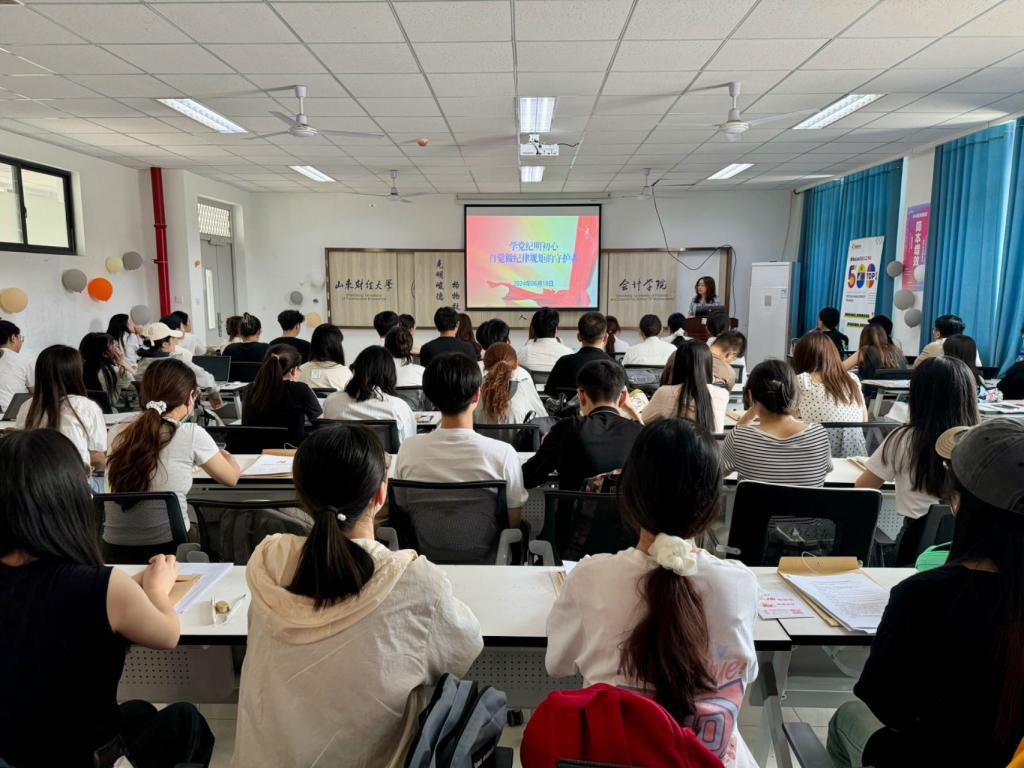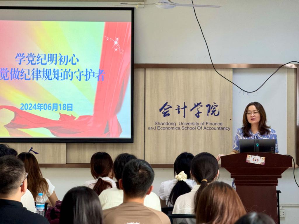 为深入推进党纪学习教育,不断提高本科生党员的纪律意识和党性修养,6月18日,会计学院党委副书记钟毓卓在圣井校区6230为学院新发展的本科生党员讲授《学党纪明初心 自觉做纪律规矩的守护者》专题党课,并传达学校第二次党代会精神。学院党委组织员、学生第二党支部书记张沫、学生第五党支部书记翟子瑜及圣井校区全体学生党员参加。