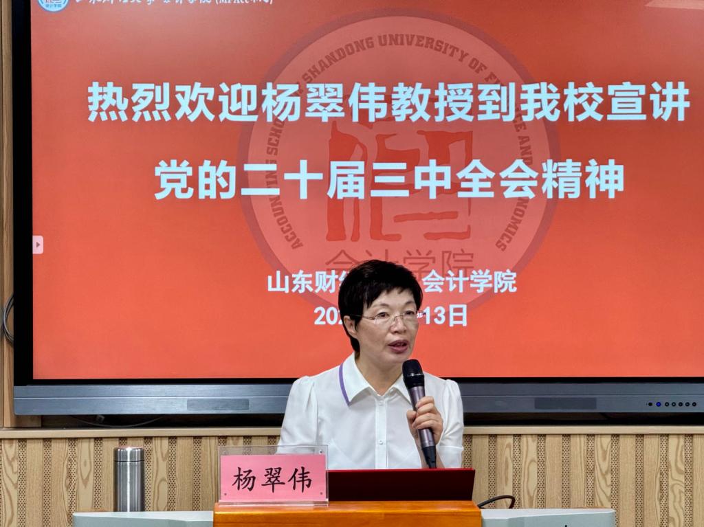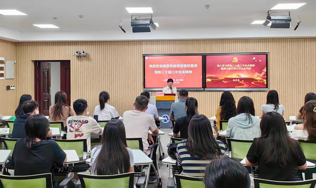 为全面宣传贯彻党的二十届三中全会精神,9月13日下午,山东省社会主义学院特聘教授、山东省讲师团宣讲专家杨翠伟教授应邀莅临山东财经大学,以《深入学习贯彻二十届三中全会精神,推进中国式现代化山东实践》为题作专题报告。会计学院党委书记邵文涛、党委副书记郑大伟及研究生参加报告会。