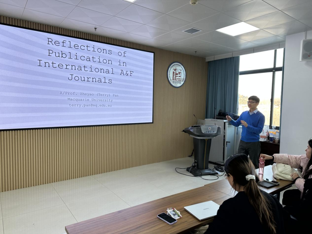 12月19日,麦考瑞大学潘哲耀副教授受邀来到课堂,为大家分享了关于会计金融期刊发表的心得与经验。潘老师结合自己的科研经历,从选题、研究方法、论文写作等多个方面,进行了详细阐述。他特别强调了阅读文献在科研过程中的重要性,鼓励同学们要广泛涉猎,积极探索新的研究领域,发掘未被充分研究的课题。潘老师的分享为同学们在学术道路上的发展提供了宝贵的经验和启示,也激发了同学们对科研的热情与动力。