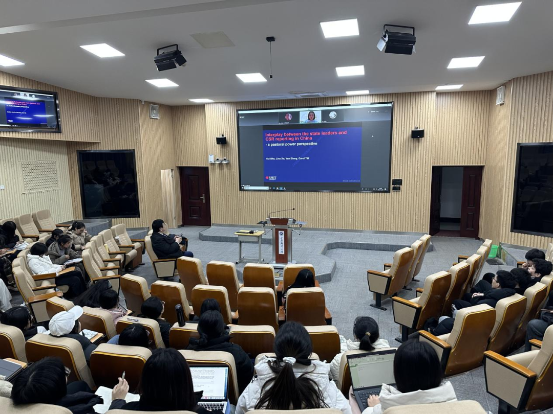 此外,黄老师还邀请了墨尔本皇家理工大学徐丽娜博士为同学们分享质性研究的写作方法。徐老师围绕其近期论文《Interplay between the state leaders and CSR reporting in China》展开,深入分析了质性研究的写作技巧与注意事项。徐老师的讲解,不仅帮助同学们理解了质性研究的独特方法,也展示了如何将全球视野与本土实际相结合,进行深度的跨文化学术分析。